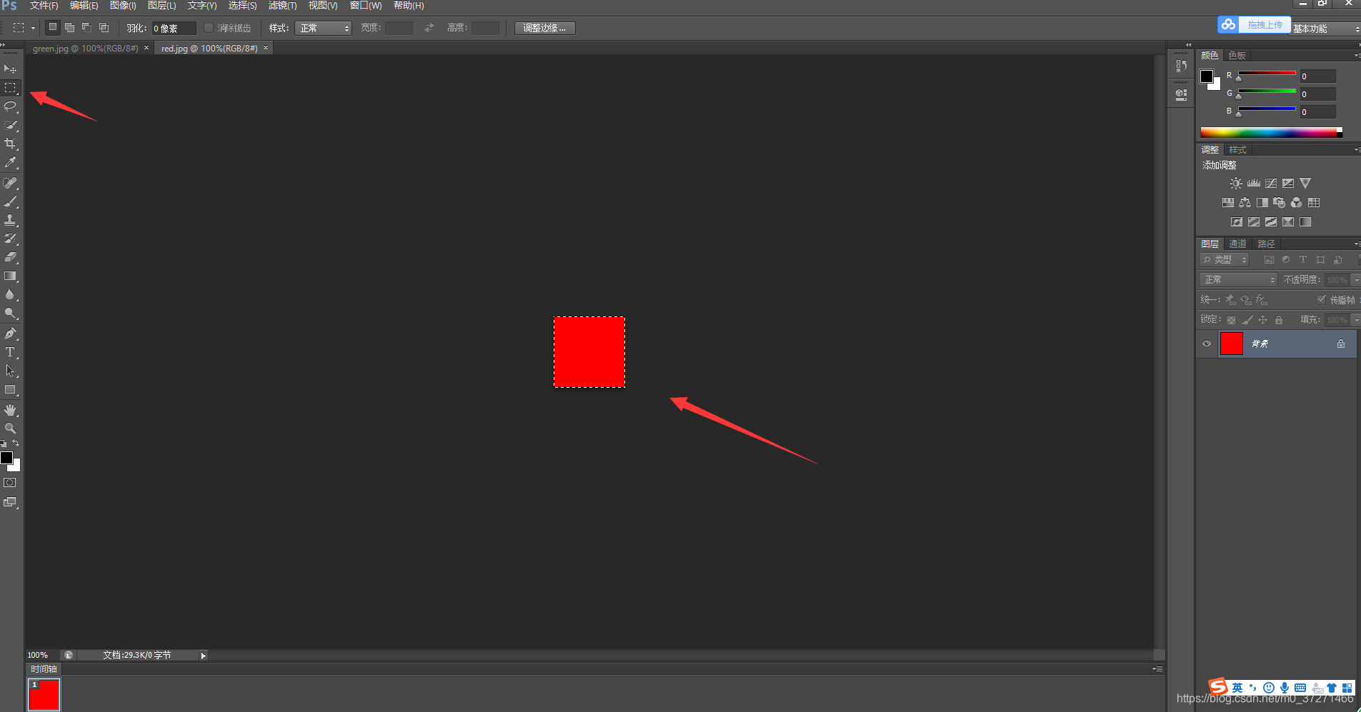 如上图用左侧的 矩形选框工具 选中中间的红色图片,并用键盘的 ctrl+c进行复制,然后打开绿色的图片,进行粘贴 ctrl+v,就显示下图的样子