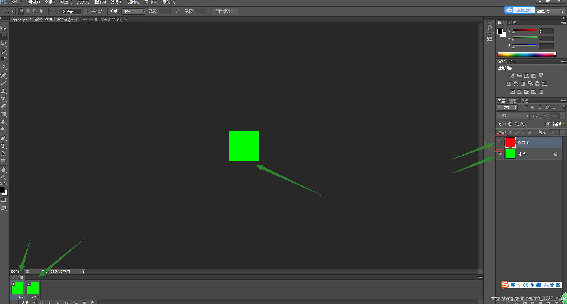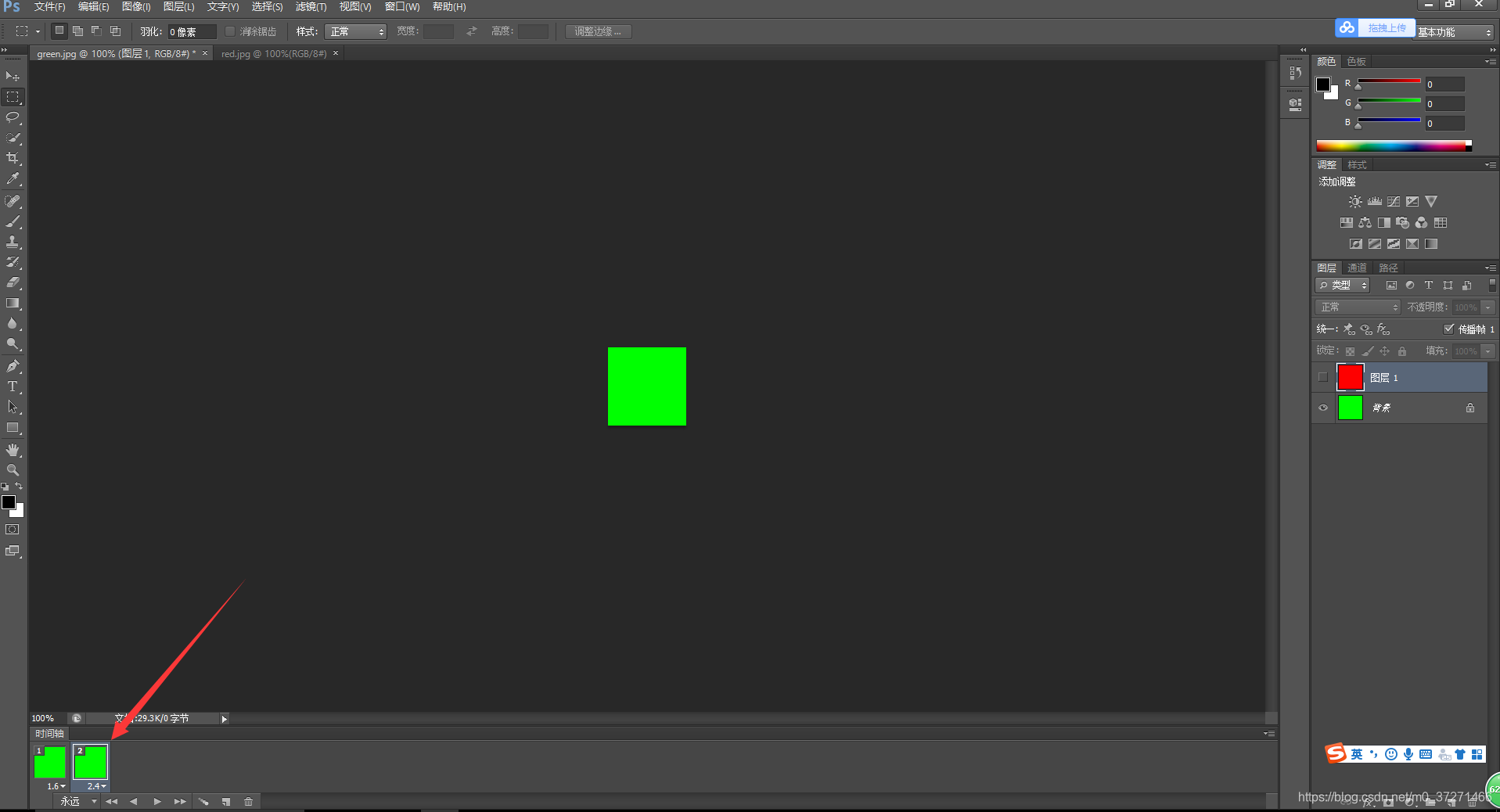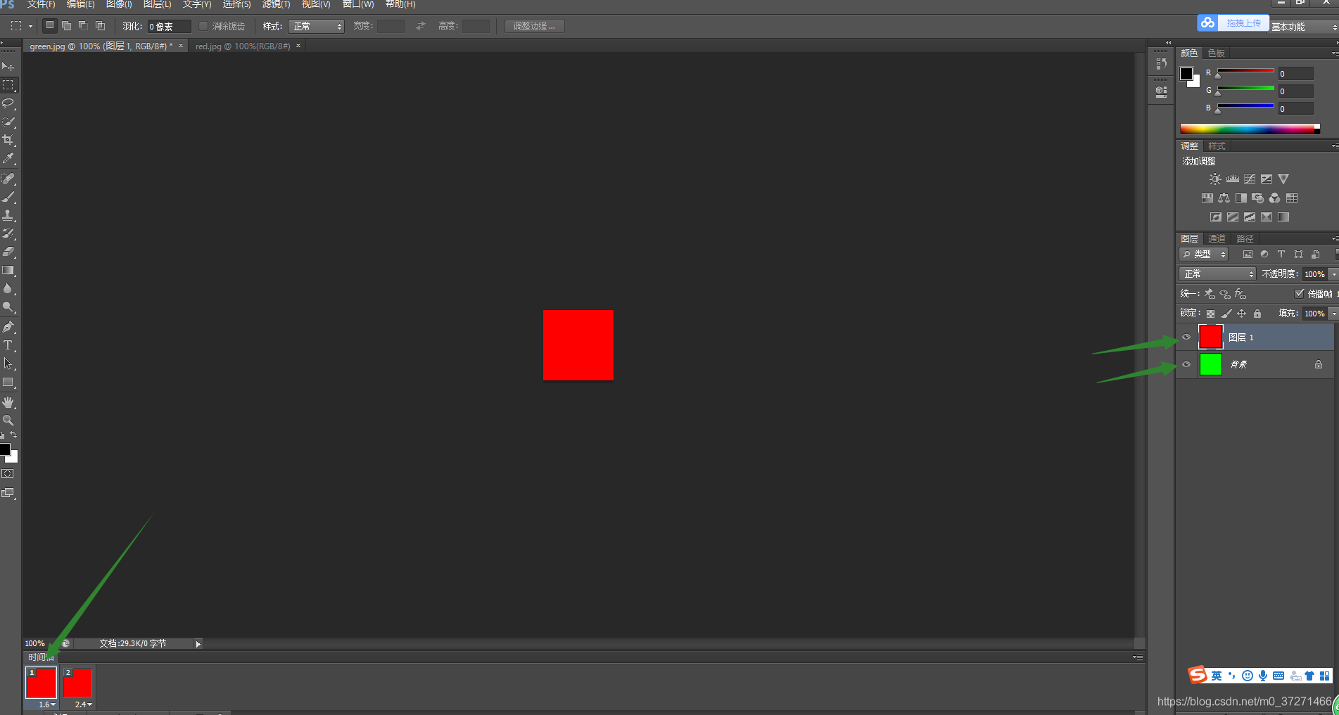 如下图:文件--打开--选中红绿两个素材图片